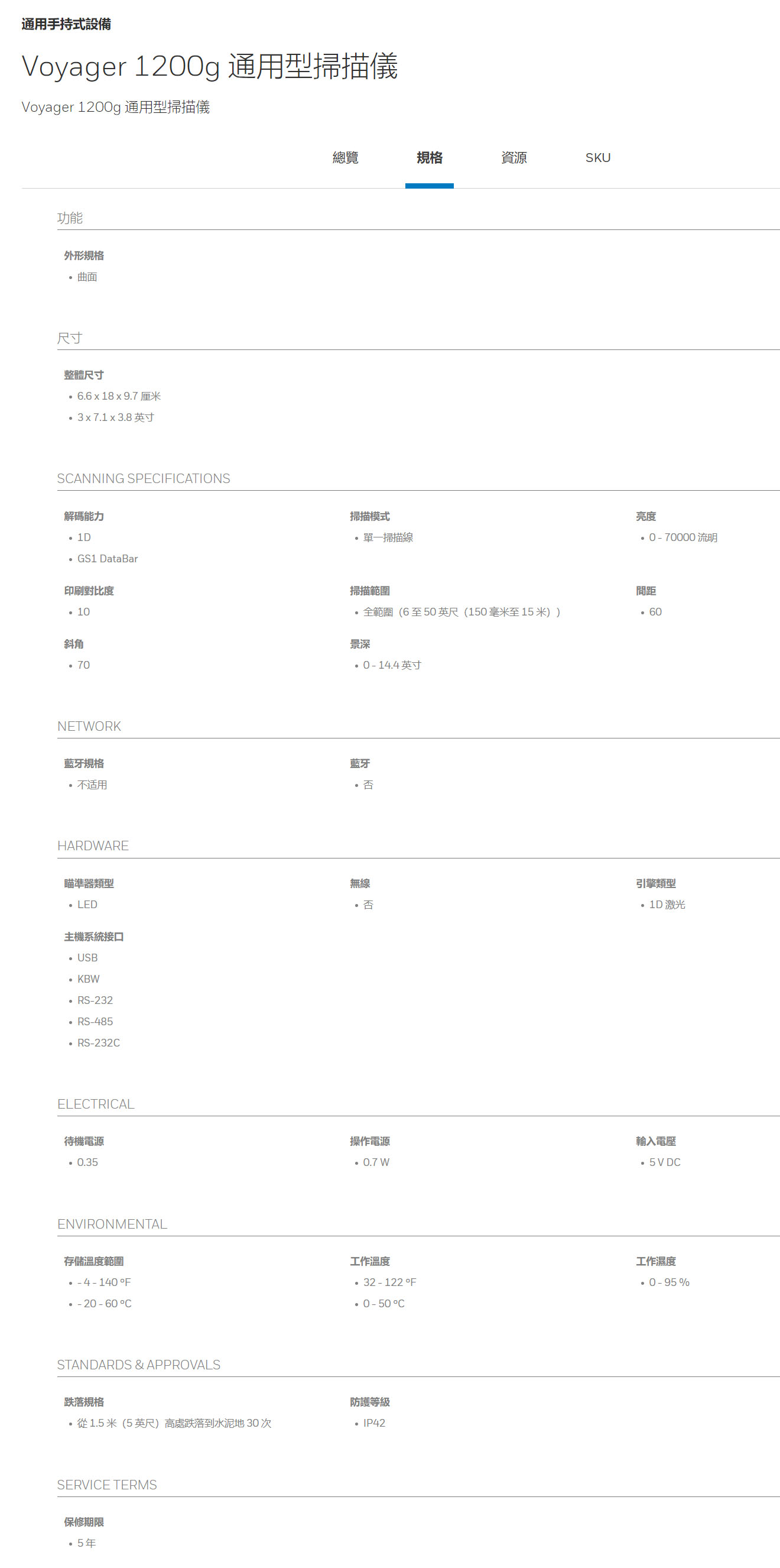 Voyager 1200g(有線)條碼掃描器為您帶來健全性能和靈活性的各類免提和手持掃描應用。無論您選擇為何種型號,該 Voyager 掃描器可為幾乎所有線性條碼提供強大的掃描性能。解碼印刷不佳、弄髒、褪色等難以讀取的條碼。掃描高密度條碼,解析度低至 3.5 密耳。在多數情況下,無需購買特製掃描器。利用 Voyager 掃描器的領先級、免提式演示掃描功能。其通過更新物件檢測及自動站內檢測及配置,使流通量達到最大化。我們設計的這些 Voyager 掃描器也可減少您的停機時間和服務成本。單一防震安裝 PCB 具有更好的耐衝擊阻抗性能。重新評估按鈕受集成橡膠合成模保護,可最小化跌落事故的影響。設計採用防護型、防刮擦玻璃窗口及 IP42 等級 如您無法找到自己的掃描器,則 Voyager’:的呼喚系統使用視覺和無線通訊信號説明您快速查找丟失的設備。
