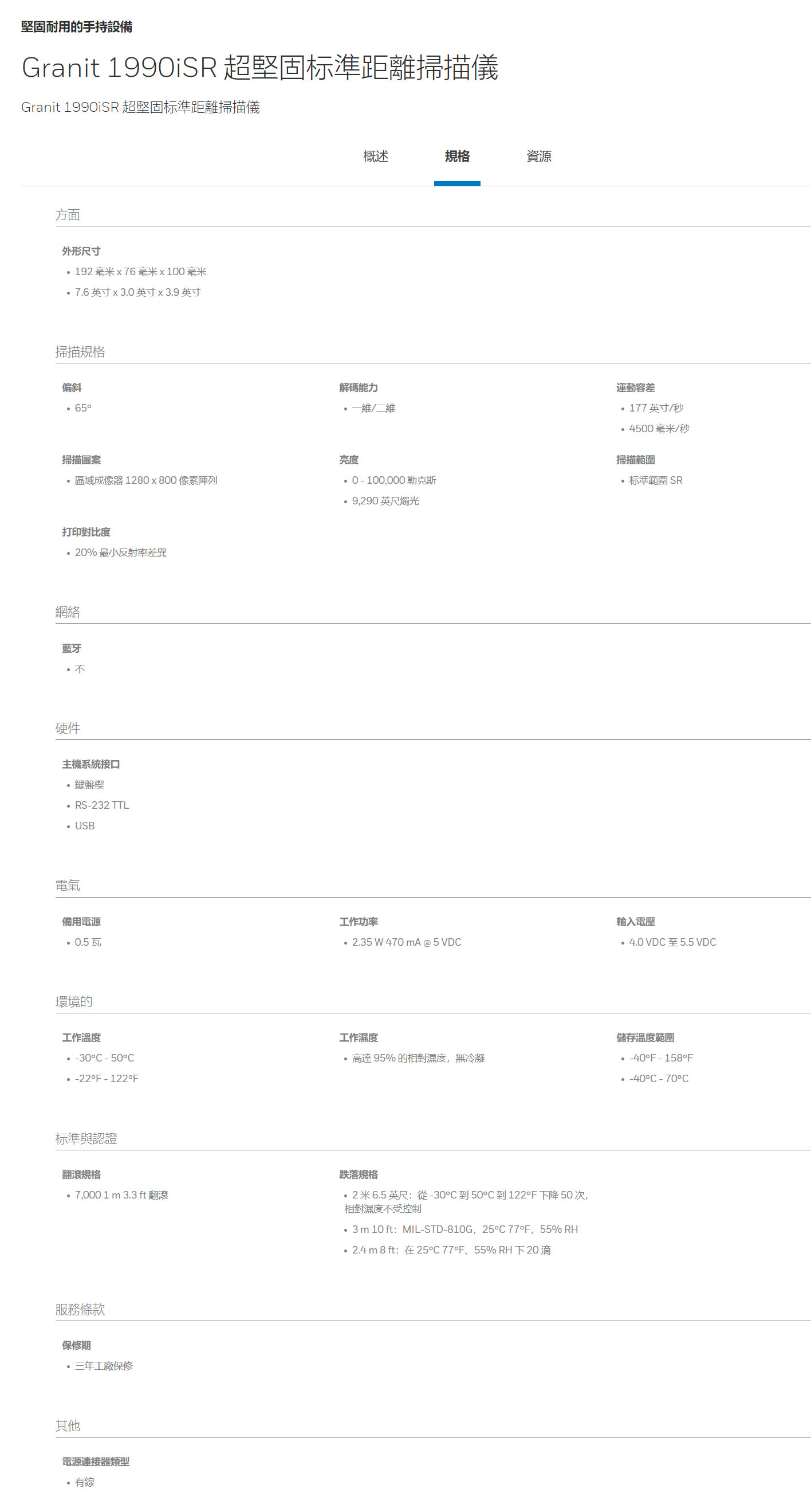 繼成功部署的傳統之後,下一代 Granit™ XP 掃描器擴展了功能並重新定義了超堅固的掃描。Granit™ XP 具有一流的 10' 跌落規格,經過精心設計,可在裝載碼頭、叉車和揀貨卡車跌落衝擊後繼續工作。1 米(3.3 英尺)的翻滾測試表明在日常敲擊和從工作站或腰部高度跌落時的長期耐用性。一流的 7,000 次滾動規格確保 Granit™ 掃描器可以長期工作。IP67 防塵和防潮密封可在嚴酷處理下保護掃描性能。條碼使資料登錄更快、更準確,最大限度地提高您的運營效率。然而,損壞和低品質的條碼會使交易變得緩慢和痛苦。由於列印品質低或在處理過程中損壞,不良標籤通常出現在倉庫/配送中心和工業空間。Granit XP 基於霍尼韋爾的下一代成像平臺構建,可確保原本具有挑戰性的標籤不會在您的流程中造成瓶頸。Granit™ XP 1990iSR 型號為標準範圍操作提供高耐用性、極高性能的掃描。Granit™ XP 1990iSR 掃描器專為需要高速掃描以最大限度提高生產力以及耐用性不可談判以降低擁有權總成本的應用而設計,提供了最佳解決方案。詳細瞭解您可以使用 Granit XP 完成什麼 確保其他具有挑戰性的標籤不會在您的流程中造成瓶頸。Granit™ XP 1990iSR 型號為標準範圍操作提供高耐用性、極高性能的掃描。Granit™ XP 1990iSR 掃描器專為需要高速掃描以最大限度提高生產力以及耐用性不可談判以降低擁有權總成本的應用而設計,提供了最佳解決方案。詳細瞭解您可以使用 Granit XP 完成什麼 確保其他具有挑戰性的標籤不會在您的流程中造成瓶頸。Granit™ XP 1990iSR 型號為標準範圍操作提供高耐用性、極高性能的掃描。Granit™ XP 1990iSR 掃描器專為需要高速掃描以最大限度提高生產力以及耐用性不可談判以降低擁有權總成本的應用而設計,提供了最佳解決方案。詳細瞭解您可以使用 Granit XP 完成什麼