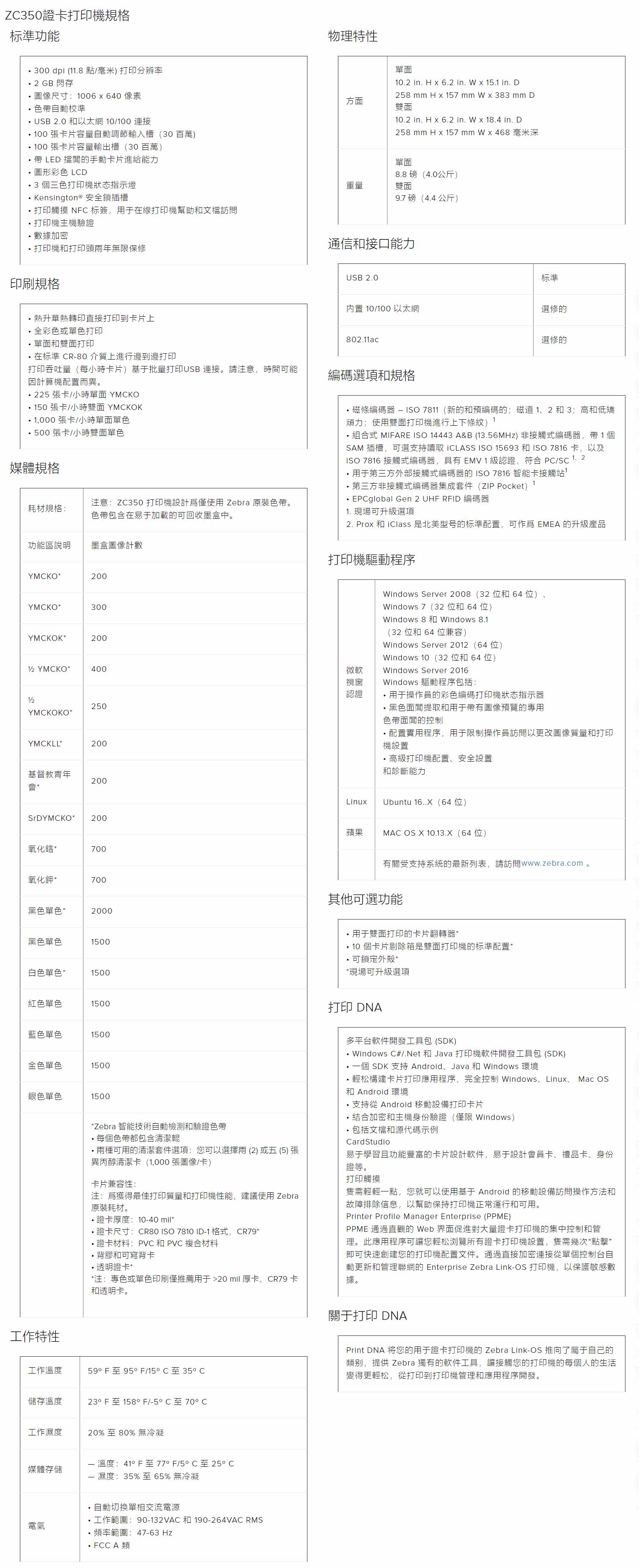 使用 ZC350 以突破性的簡單性設計和列印幾乎任何卡片。您可以隨時隨地以閃電般的速度列印所需的內容。使用提供特殊顏色和特殊效果的新色帶列印單面或雙面邊對邊彩色或黑白卡片。即使是最複雜的卡片,您也可以獲得簡單的按鈕式卡片列印。此類印表機中最纖薄的適合無處不在的設計,讓您可以在任何需要的地方輕鬆添加卡片列印。由於幾乎所有編碼選項都集成在一起,您可以開箱即用地列印接觸式、非接觸式、感應式或磁條卡。