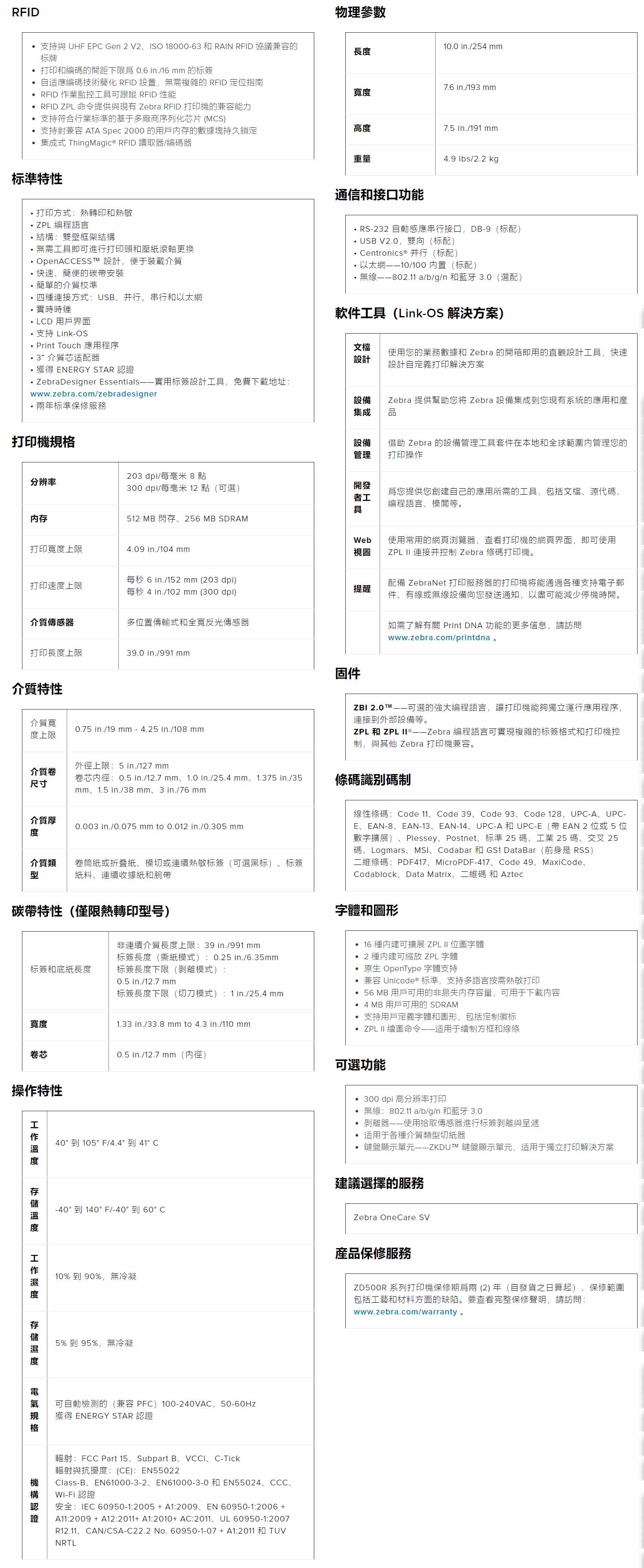 印表機能夠通過一系列標準特性應對嚴苛的應用需求,包括並行、串列、USB 和乙太網連接;大容量記憶體;以及 ZPL® 程式設計語言。可選選項包括切紙器與剝離器、Bluetooth® 與 Wi-Fi® 認證通信以及 300 dpi 高解析度列印。