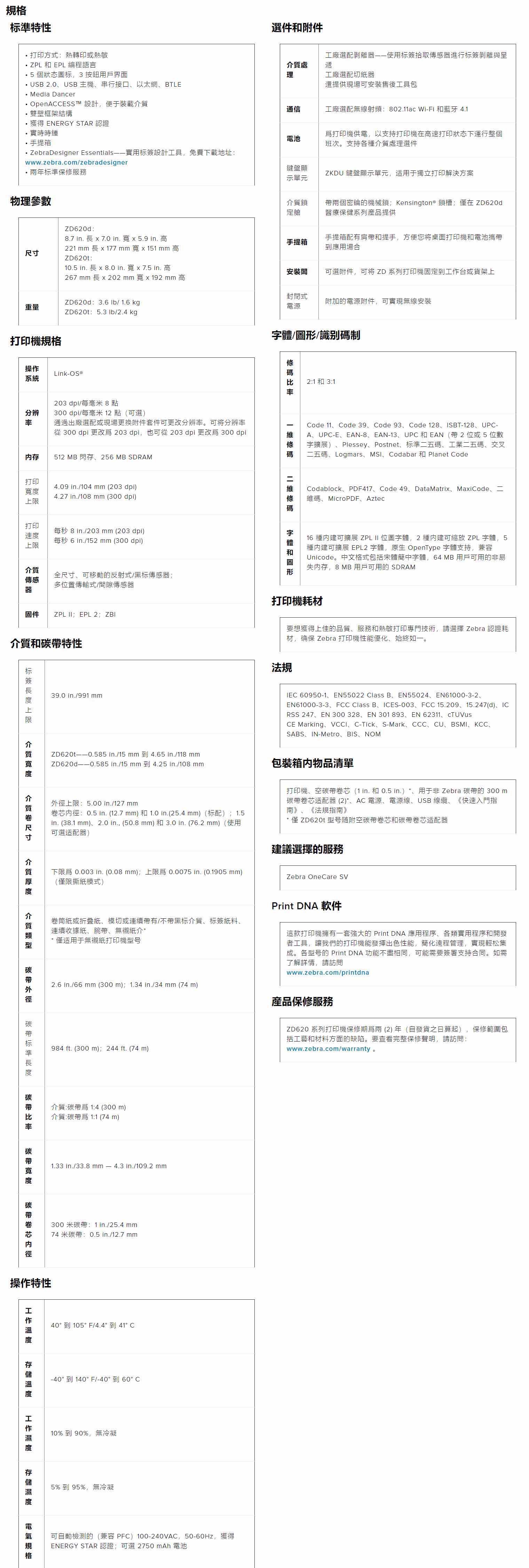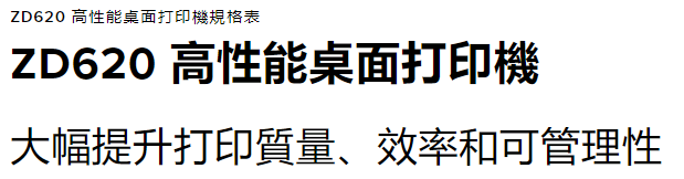 ZD620 列印品質上乘、生產效率高、應用靈活且管理簡便,可滿足您的所需。緊湊型桌面熱轉印和熱敏印表機品質出色,其工業列印水準卓越,較同類產品而言列印速度快、列印品質高。