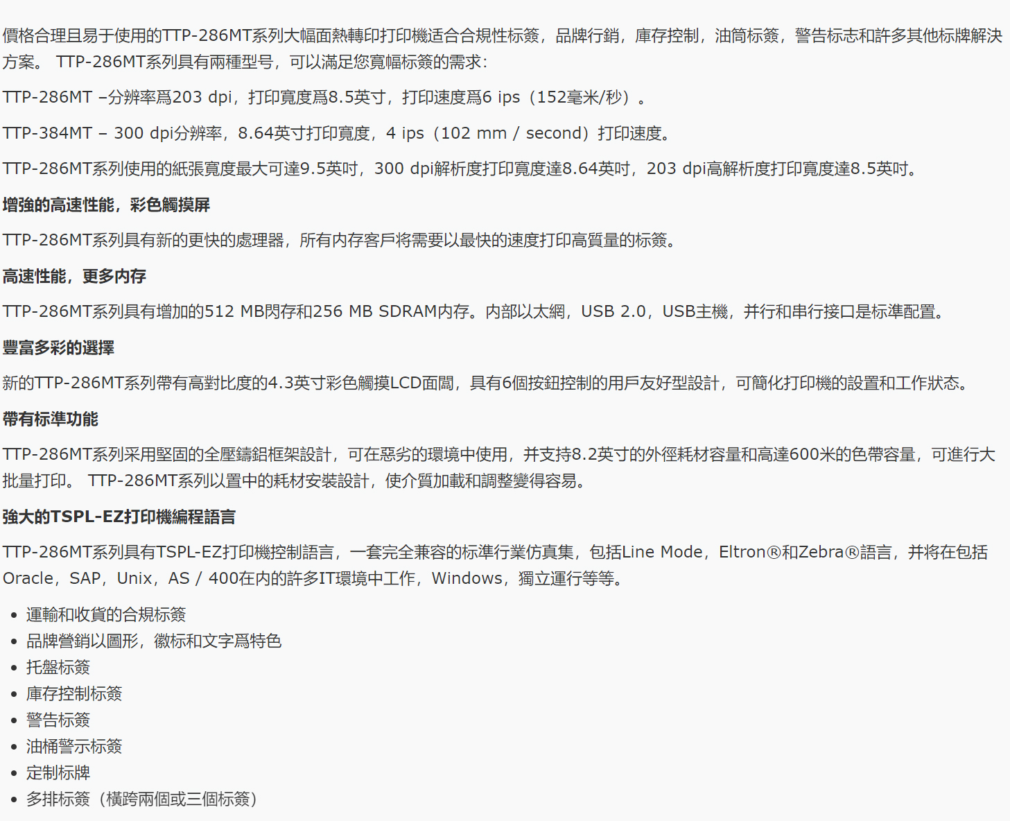 TTP-286MT 系列 8英吋 工業型 熱感式/熱轉式 條碼印表機