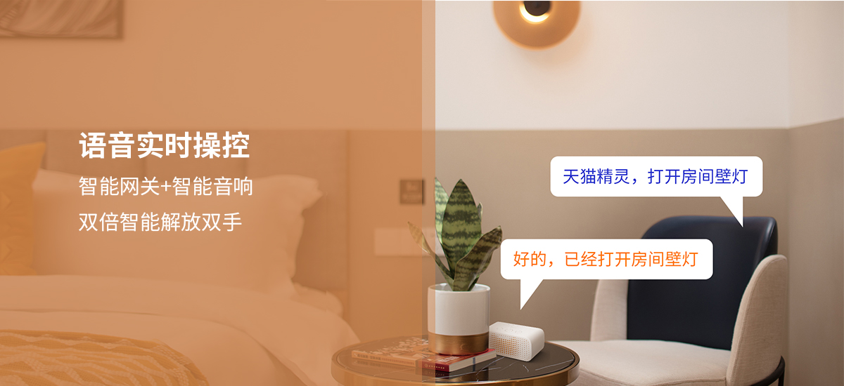 房间内的语音助手如天猫精灵、百度的“小度”都可以连接网关,实现用语音进行控制,例如客房内的电视、窗帘、背景音乐、灯光、空调、房间的情景模式等。