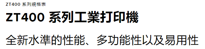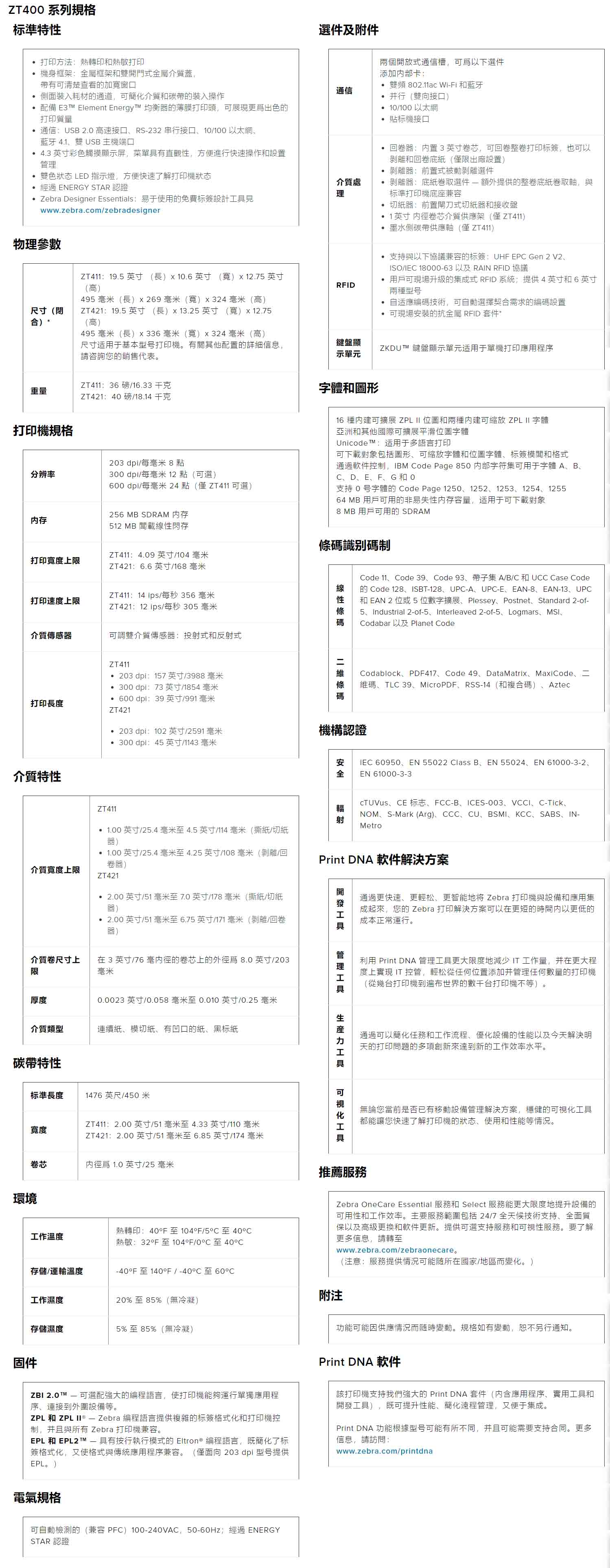 ZT411 帶有 4.3 英寸的全彩觸摸顯示幕,可使印表機狀態一目了然;列印寬度可達 4 英尺,列印速度最快可達每秒 14 英寸。可實現高解析度 (600 dpi) 列印。增加 RFID 功能,可方便對通用型 UHF RFID 標籤或厚度更厚的抗金屬標籤進行列印和編碼操作。