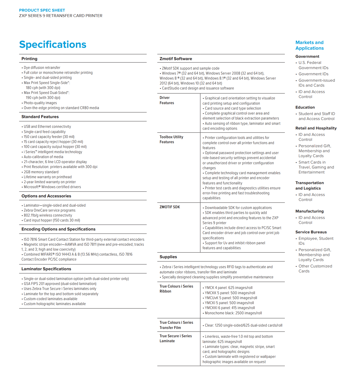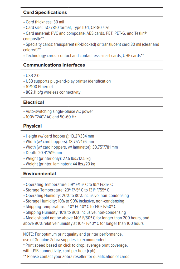 *Note: Print speed based on click to drop, average print coverage, with USB connectivity, card per hour (cph)