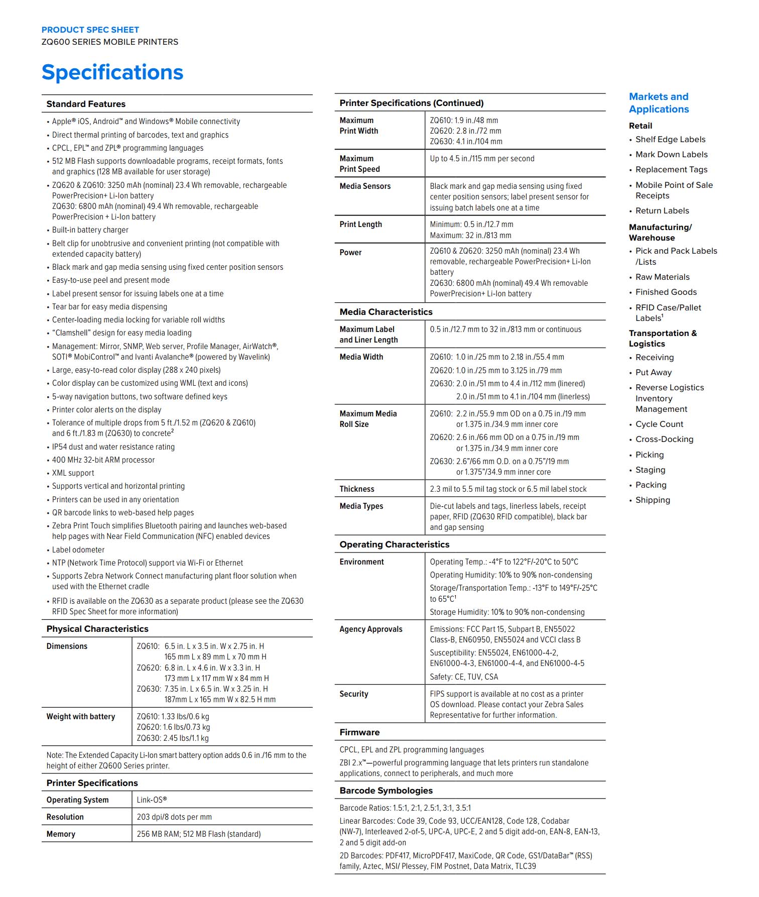 Improve your warehouse management and logistics with the ZQ630 mobile printer. Optimized for high volume label printing, but also prints receipts, the ZQ630 mobile printer can be mounted to a forklift for easy access while moving through-out the warehouse.