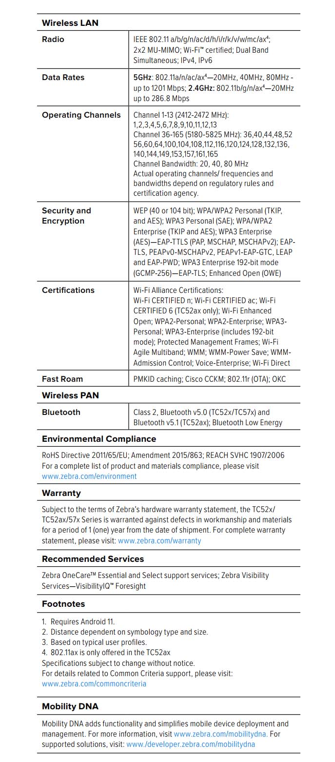 The rugged Wi-Fi only TC52ax Mobile Computer, armed with the latest mobile technology advancements including Wi-Fi 6, a new extended range scanner option with intelligent focusing, Device Tracker, the new Workstation Connect solution and Zebra's Mobility DNA tools, makes the TC52ax the ultimate rugged mobile computer for workers inside the four walls.
