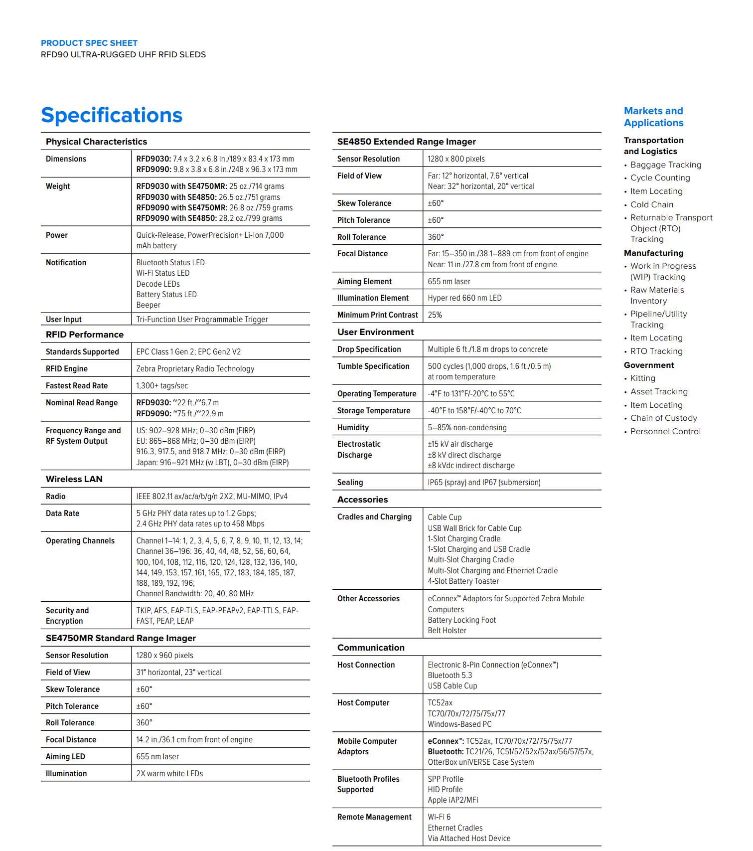 The RFD9030 Ultra-Rugged UHF RFID Sled enables rapid inventory counts and increased workflow accuracy across a wide variety of harsh conditions with a standard read range of 22 feet (6.7 meters).