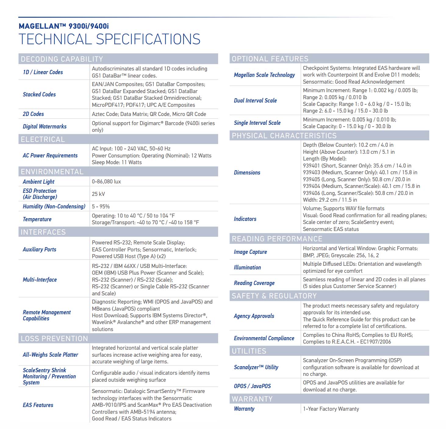 The Magellan™ 9300i scanner and scanner/scale: a new class of high performance bar code scanners. With digital imagers in all planes, the 9300i scanners read both 1D and 2D bar codes seamlessly without requiring item orientation by the cashier.